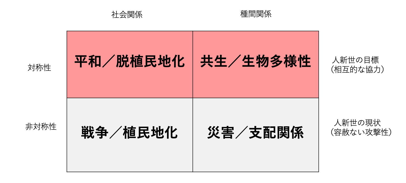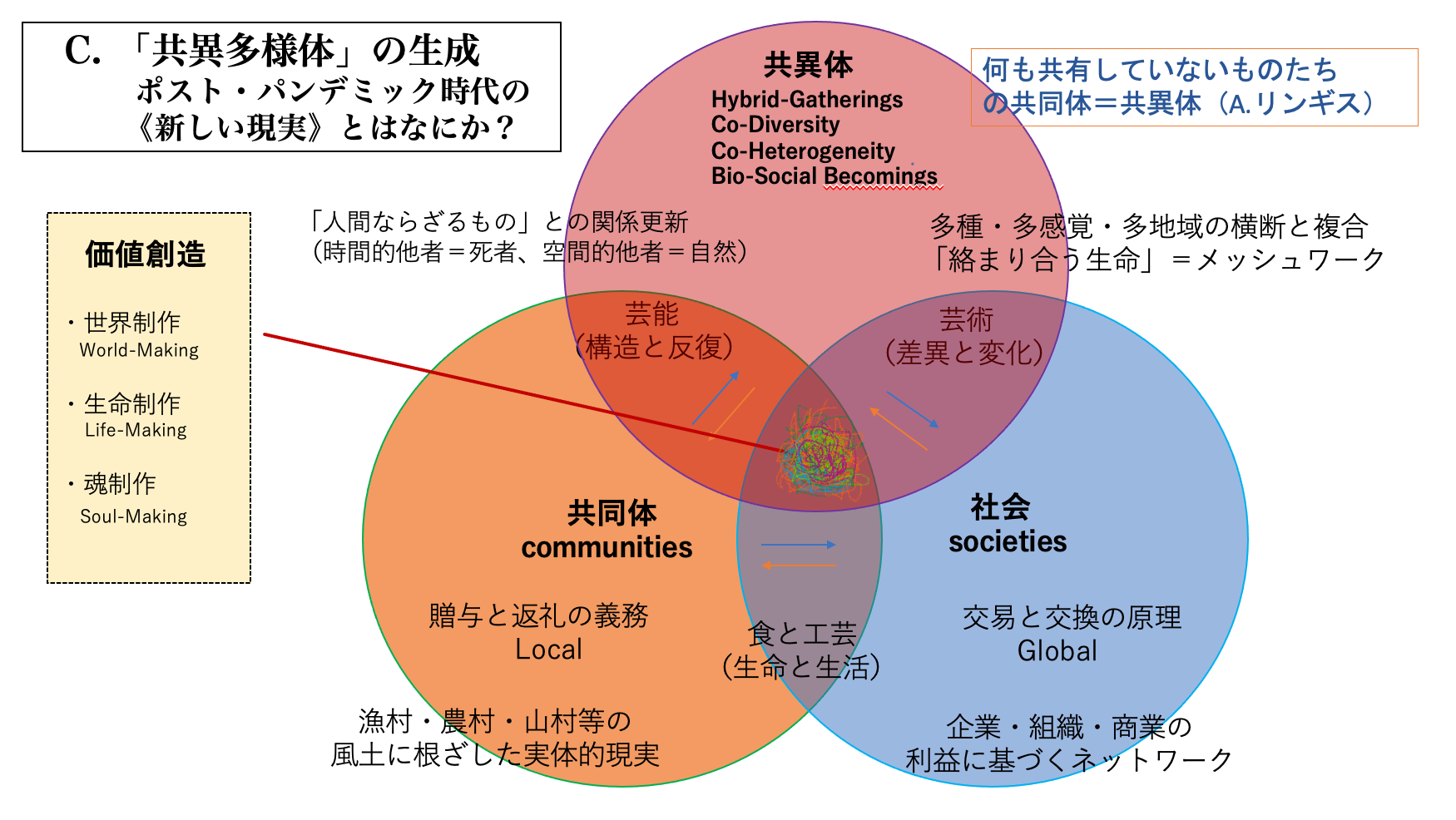 <私は、人類や他の生命は共同体ではなく“共異体”だと思っています。同一性が担保された社会モデルではなく、そもそもお互いが違った存在、異種であることを前提としています。そして、個々の差異を解消しないままに、ゆるやかに繋がっていくような概念ですね。>※16