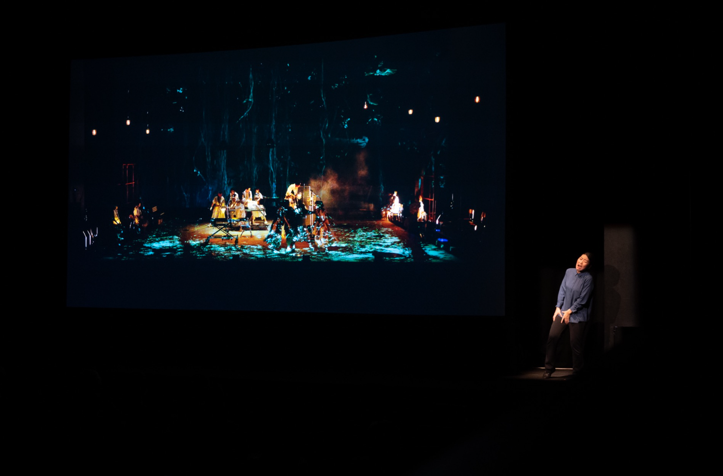 (画像7)手話弁士の様子。撮影:宮田真理子(THEATRE for ALL「手話弁士つき舞台映像の上映会 その新たな可能性─EPAD × THEATRE for ALLユニバーサル上映会開催レポート(前編)」より、筆者補足)