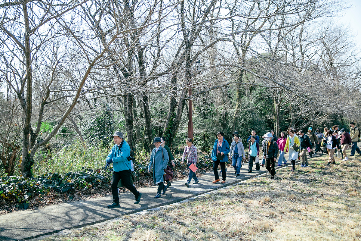 春らしい陽気のなか、改修中の美術館の一角でレクチャーがスタートしました。バンテリンドームナゴヤおよそ6個分の広大な敷地に建つ愛知県陶磁美術館(以下、美術館)は、陶芸館・本館・西館・南館・茶室などの建物を囲むように森が広がる、豊かな自然のなかにあります。名古屋駅からは地下鉄やリニモなどを利用しておよそ1時間弱、近隣には2005年の愛知万博会場であった愛・地球博記念公園や海上の森(かいしょのもり)があります。この場所にどうしてやきもの専門の美術館が誕生したのか。それを考える前に、まずはその「豊かな自然」や「環境」がどういったものなのか、外に出て体感するため"お散歩"に出発しました。