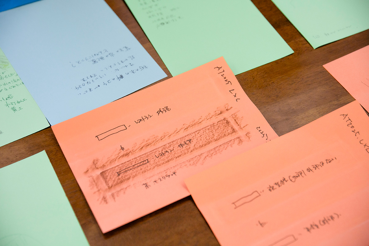 色とりどりの画用紙には、様々な発見や気づきが集まりました。屋外に設置された作品をスケッチした人もいれば、建物の構造や照明などが気になった人、木々や小花などの植物を描いた人もいました。散策中に考えたことや参加者のメモから気づいたことなどを、佐藤さんとラーニング・チームのメンバーで話し合いました。