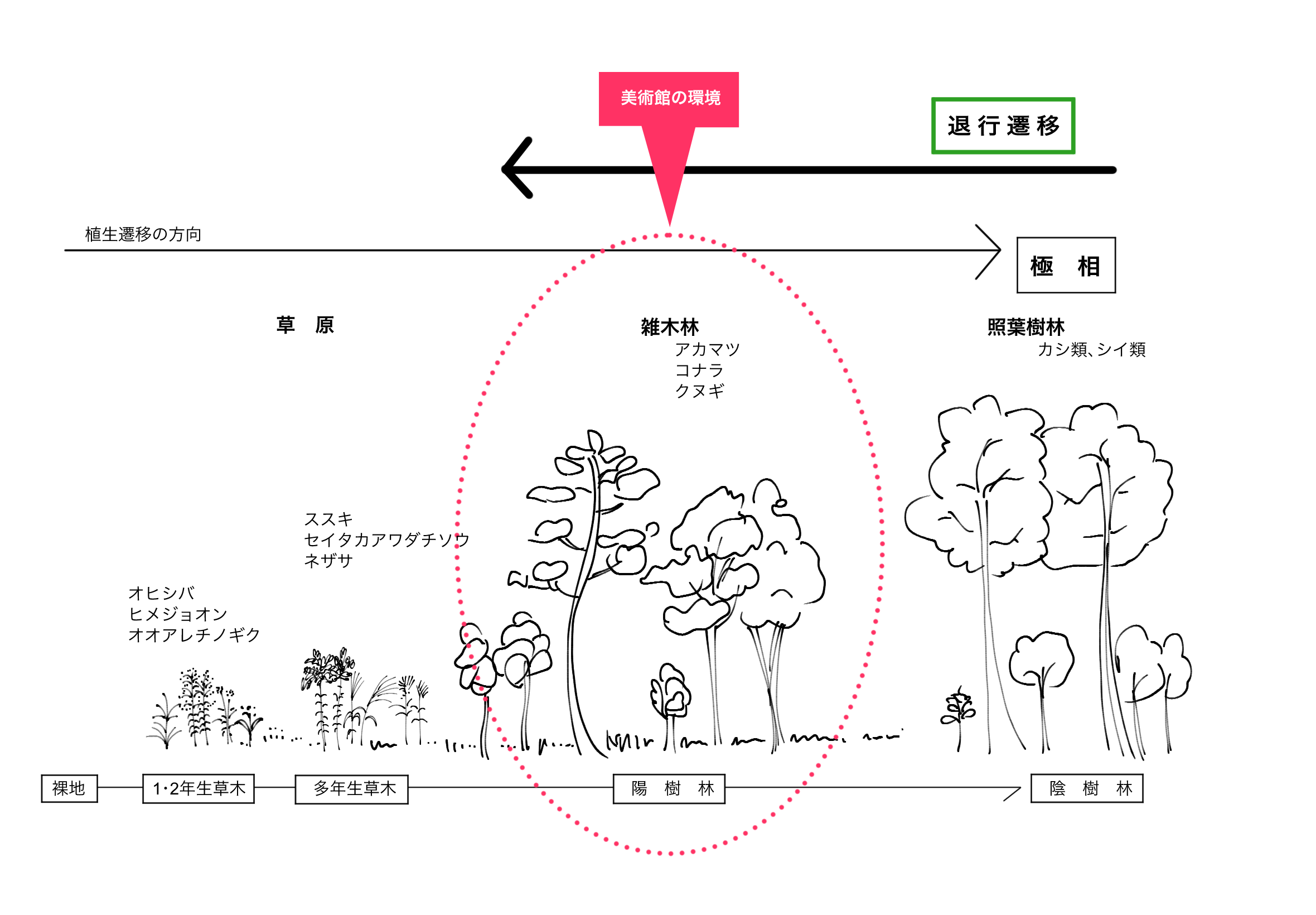 (図1)植生遷移の図(筆者作成)。レクチャースライド、平成7年版環境白書第3章3節2項参照。