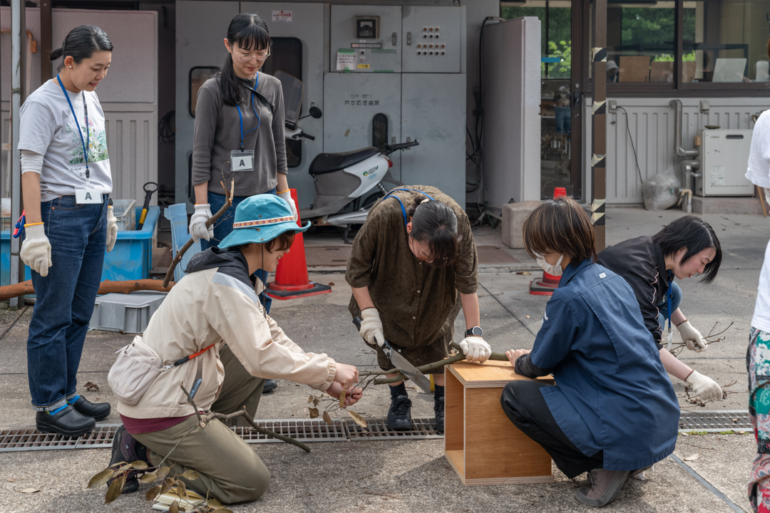 参加者は4つのグループに分かれ、ローテーションで「枝を集める」「粘土を集める」「枝を燃やす」という活動を体験しました。各グループにはラーニングチームメンバーが入り、それぞれの体験には陶芸館のスタッフや美術館の学芸員も参加し、参加者とコミュニケーションをとりながら活動していきました。