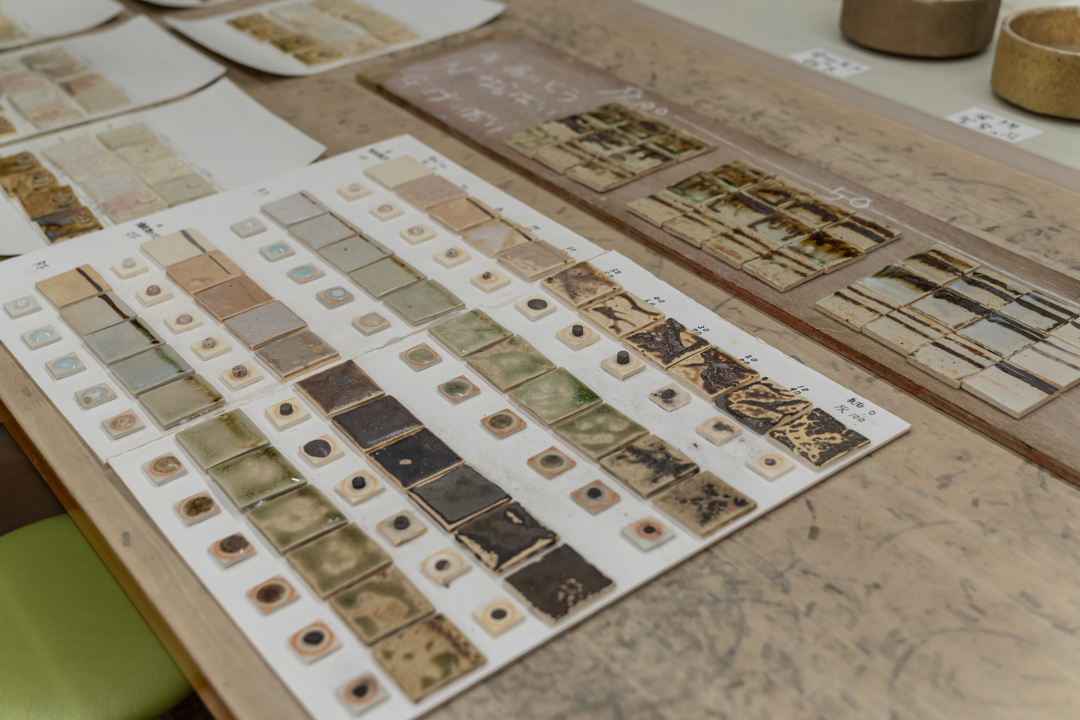 薪焼だと温度調節が難しいので、安定した結果を得にくいですが、それもまた表現として大切にできる点です。電気窯で焼くとコントロールがしやすくなります。焼成温度や時間をプログラムできるので、同じ結果を得やすくなります。本焼をする前に、このように(画像2)小さいチップで実験をして、その結果を参考にして作品をつくります。