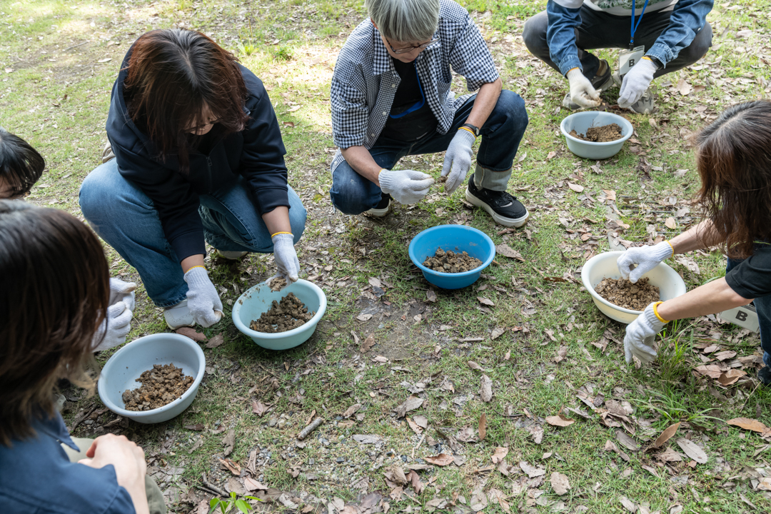 美術館には粘土層が地表に露出している箇所があります。そのうちのひとつで、陶芸館のスタッフの案内で参加者それぞれがスコップで地面を掘って粘土を集めました。採取の際には、美術館の学芸員である大西遼さんから粘土層のことや、古窯のこと、やきものの焼き方などについて参加者からの質問を受けながら説明していただきました。