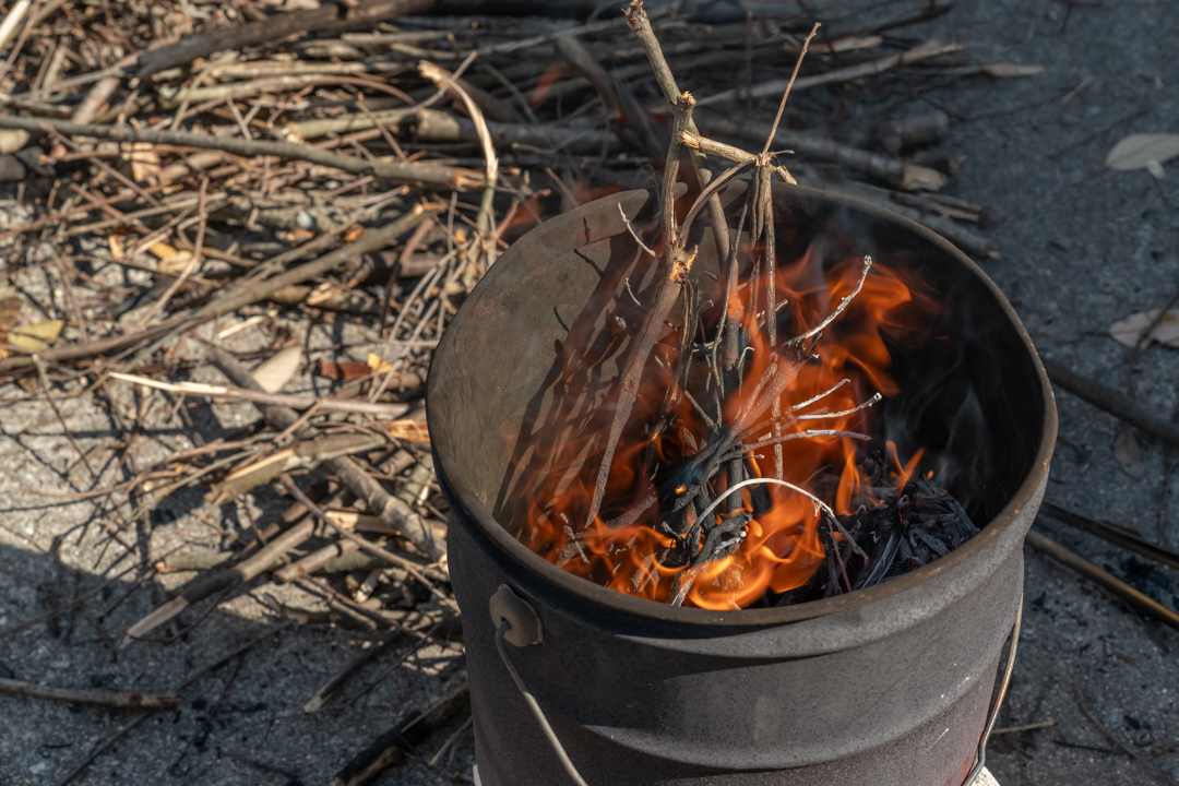 集めた枝は一斗缶の中で火にくべます。焼成場所を3箇所つくり、各グループ交代で火の番をします。ここでは、陶芸館スタッフの佐藤さんと美術館学芸員の澤井さん、そして学芸員でもあり「あいち2025」のキュレーターでもある入澤聖明さんも火の番人として、陶芸館のスタッフの方々とともに活動してくださいました。