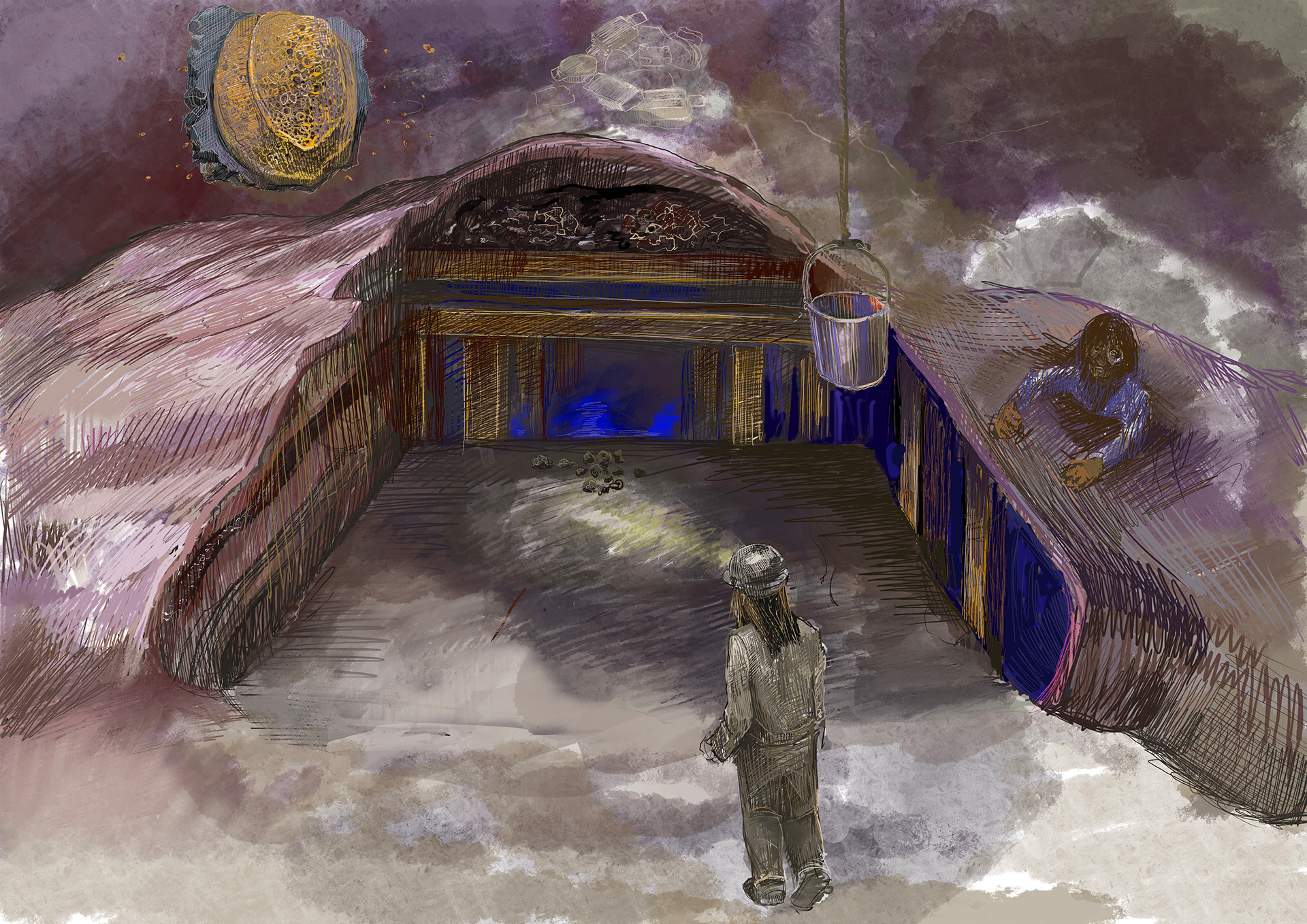 蜜蜂と労働は直結するイメージですよね。蜜蜂って頂点にいるのもメスで、メスだけが働き、オスは女王蜂に子を生ませるだけのために存在するという社会。太白のリサーチに行ったのは台本を書いた後だったのですが、鉱山の傾斜を使って養蜂をしていたのを見て驚きました。くりぬかれた丸太の中で蜂蜜を作っていたのを見て、その丸太は坑道で使われていたものなんじゃないかと思ったりしました。たまたま太白で案内をしてくれた方がインフルエンサーだったんです(笑)。彼とはご飯を食べながらいろいろ話をしたんですが、最近彼が経済に興味があるということをずーっと話していて。ソウルという都市に対し、田舎である太白ということや養蜂と経済みたいなことで軸が交差していく感覚があるなと思いました。