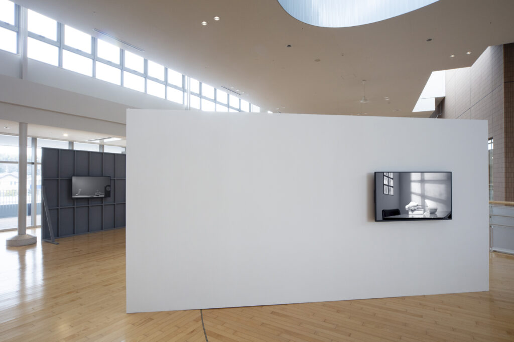 取調室のような密室の空間で、人の手や本といったオブジェが机に並んだ光景が、左右にゆっくりと動くカメラで捉えられています。その映像を映すディスプレイが掛けられた壁の裏面には、撮影された机の上を、反対側から見た様子が映されています。