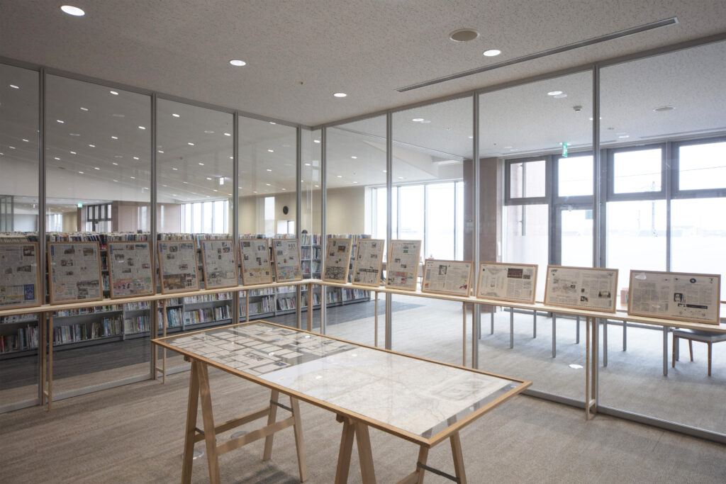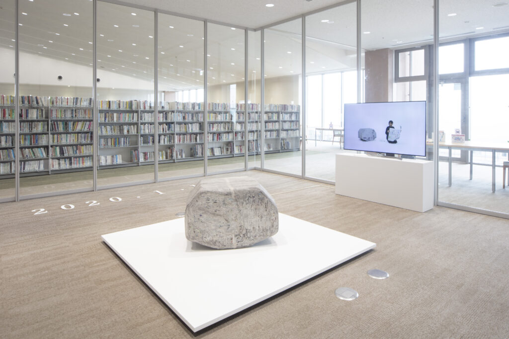 今回の作品では、新聞が新聞であるかどうかわからなくなるような物体を、まさに紙に文字を記してさまざまな情報や記憶を蓄積する図書館の本棚のあいだで展示します。まるで神体としての石のように、祈りを捧げられる対象として空間に鎮座するこの物体は、情報や歴史を紙に蓄積し、出来事を記憶し、未来に残そうとする人間の意思や営為について考えさせます。