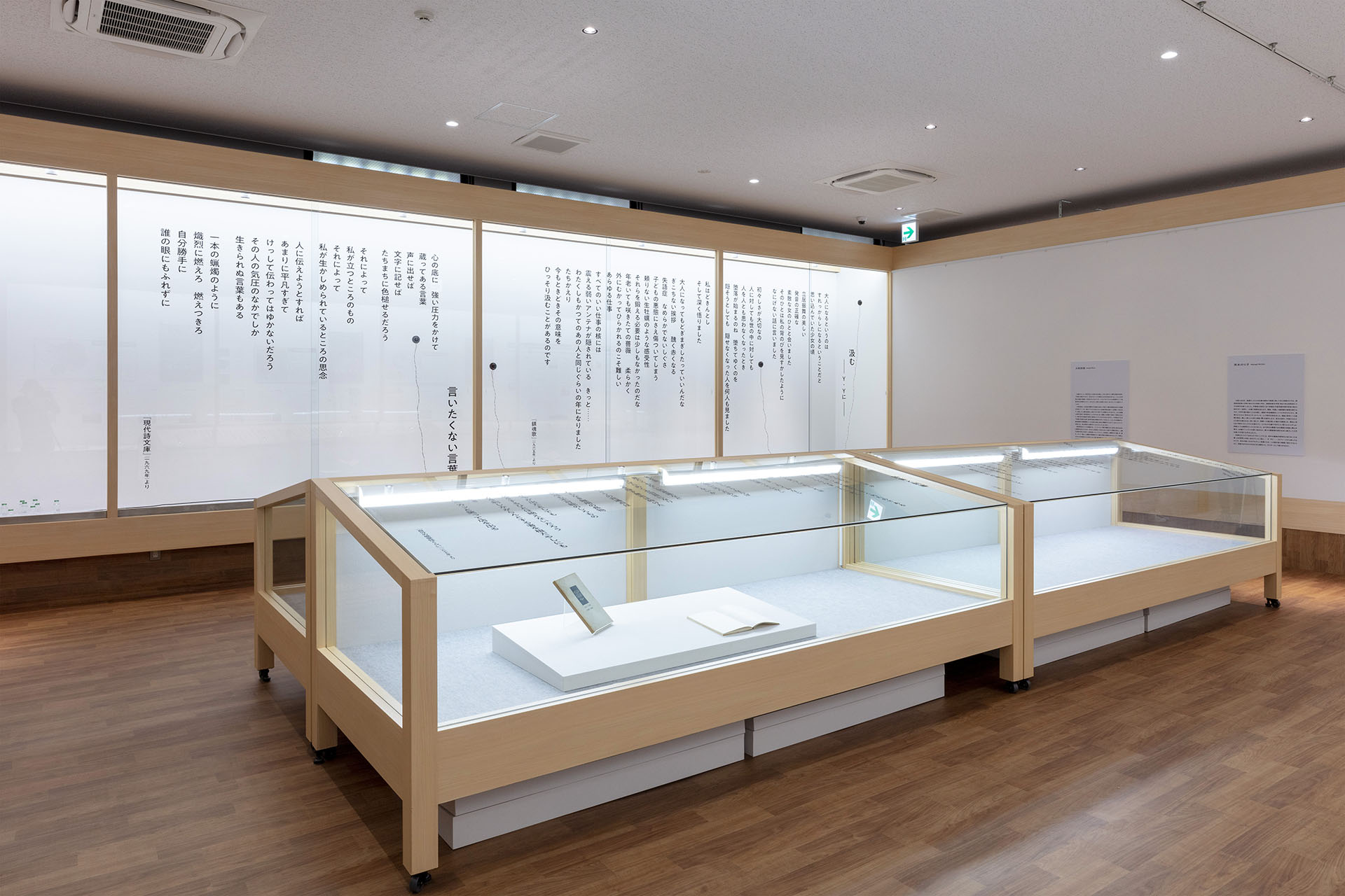 本展のタイトル「なめらかでないしぐさ」は、茨木が戯曲作家時代に知り合った女優・山本安英との思い出をうたった「汲む──Y・Yに──」のフレーズから採ったものです。茨木が紡いだみずみずしい言葉たちを、この展示室で数篇ご紹介するとともに、西尾のまちなかのさまざまな場所にも、ポスターとして散りばめます。