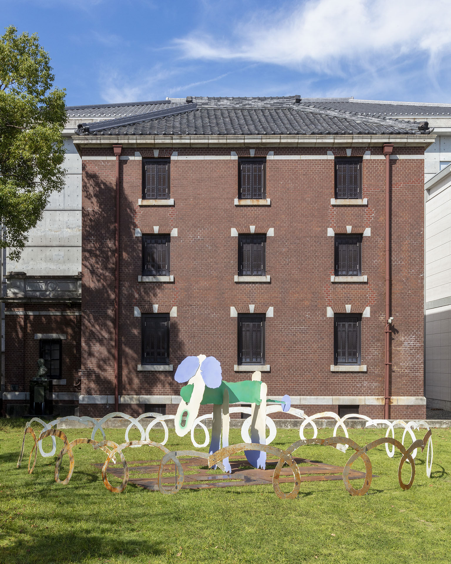 西尾市岩瀬文庫の旧書庫前には、まるでカラフルな紙をハサミで思いつくままに切って糊づけしただけに見える《dog (big)》が置かれています。そのペーパークラフトのような見かけの軽やかさとは裏腹に、神農理恵の作品は、火花を散らしながら切り出した厚く重い鉄板を自重とのバランスを考えながら溶接するという、とてもハードな作業を伴います。あくまで形は行き当たりばったりに決まってゆき、自立するかどうかはやってみないと分かりませんが、それがうまくいった時、鉄板はたちまち血の通った生き物になり、軽やかに動き出すかのようです。