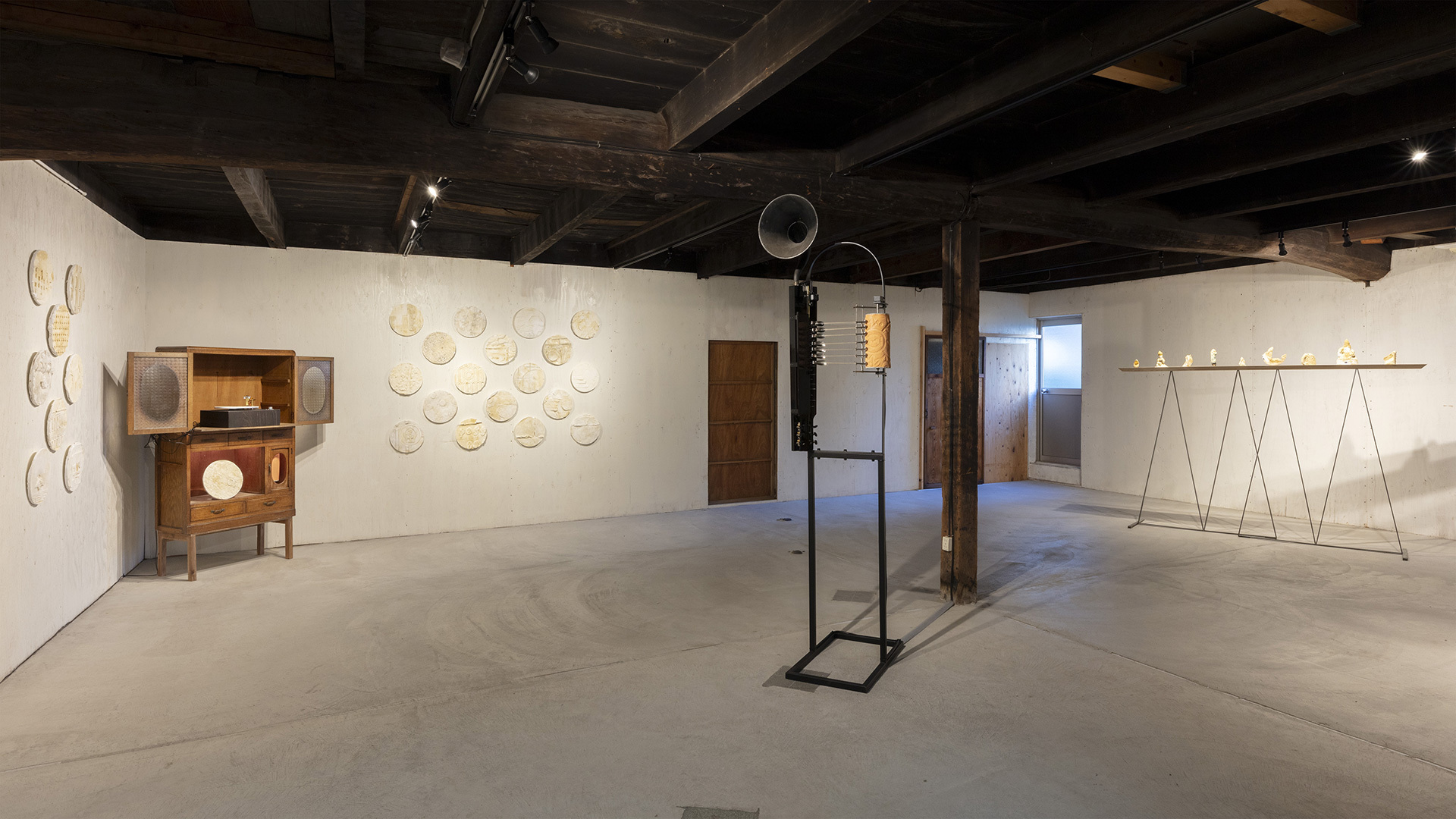 今回、藤田は瀬戸の街を散策し、マンホールや石垣、公園のタイルなど、街の至るところに見られる特徴的な模様を粘土を使って採集し、その凹凸を音に変換することで、瀬戸の街を聴覚的に再現しようと試みます。視覚的にも美しいこれらの模様は、藤田自らが設計したレコードプレーヤーやオルゴール機を通じて、音となって空間に響き渡ります。また、陶片に土が降り積もる作品では、焼かれることで陶片として固定された過去の時間と、その上に積もりゆく生の陶土がはらむ可変的な未来という、2つの異なる時間軸を融合させることを試みています。