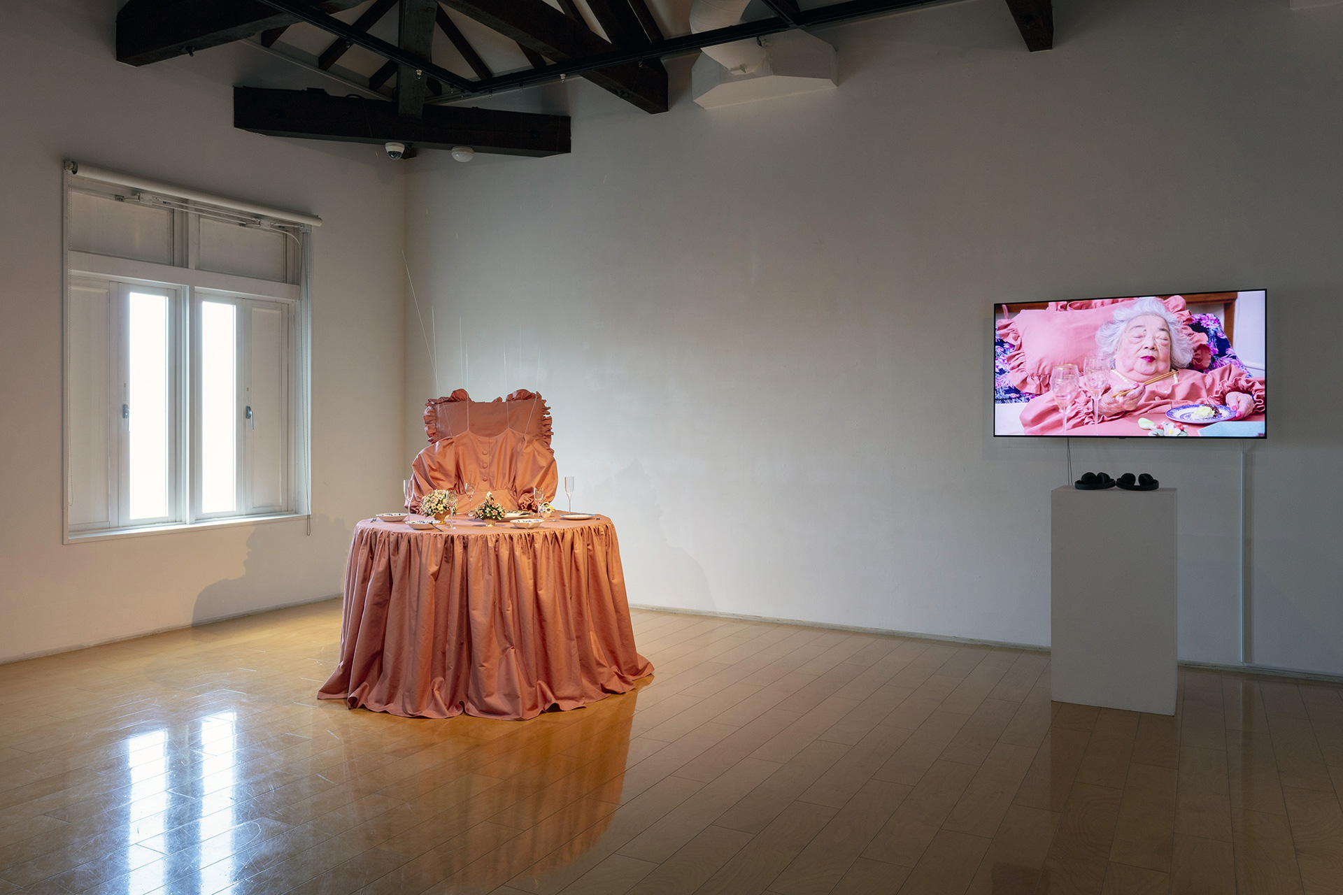本展にあたって津野は、ベッドの上での臥床生活となって介護を要するため、共に食卓を囲むことが難しい最愛の祖母との日々の経験を元とした制作に取り組むことを決めました。介護を要するということは、これまでとは異なる日常を受け入れ、生活様式を変化させていくことが暗黙の前提となってしまいます。しかし、津野はその変化を受け入れつつも、介護ベッド上の祖母がテーブルクロスと一体となった衣服を着用し、他者を招き入れるという作品をつくることで、食卓を囲むというこれまでの日常を新たなかたちで実現しました。そこには家族や親族たちの温かで穏やかな関係性が可視化されています。さらに本作は、衣服が物理的に人々の間に介在することで、より密なコミュニティを構築し得る可能性も示唆しているのです。