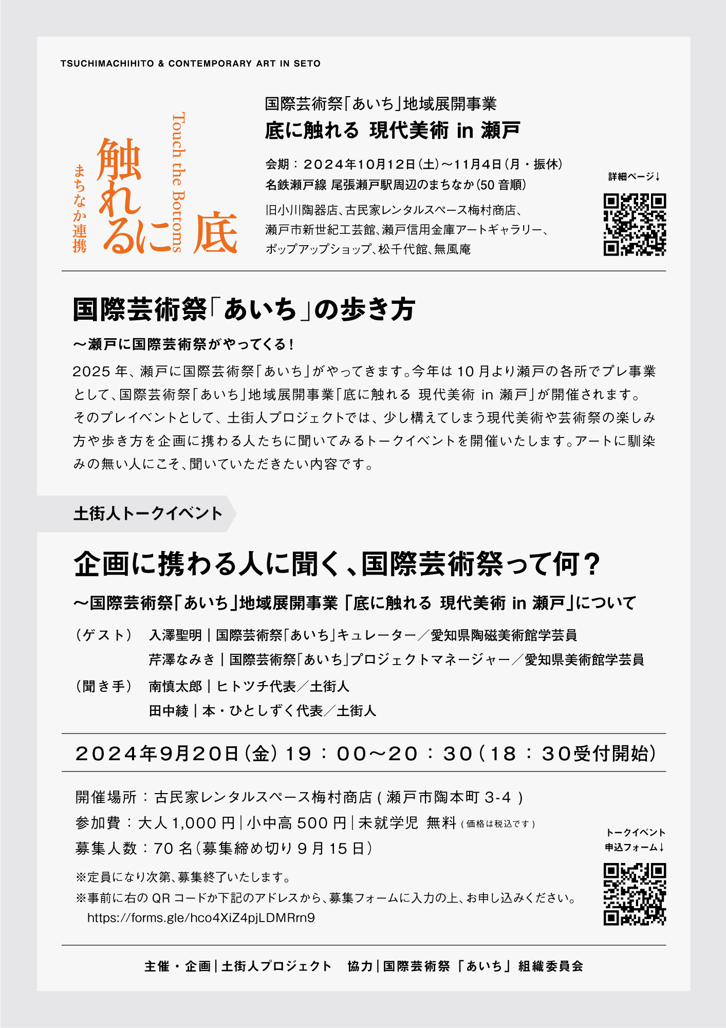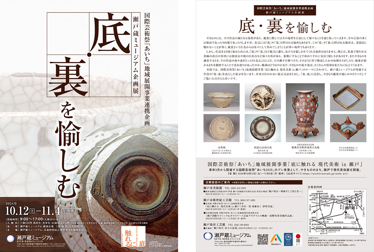 国際芸術祭「あいち」地域展開事業「底に触れる 現代美術 in 瀬戸」と同時期に、事業のテーマや企画等と連携した内容で開催される、瀬戸市等が主催の企画展です。