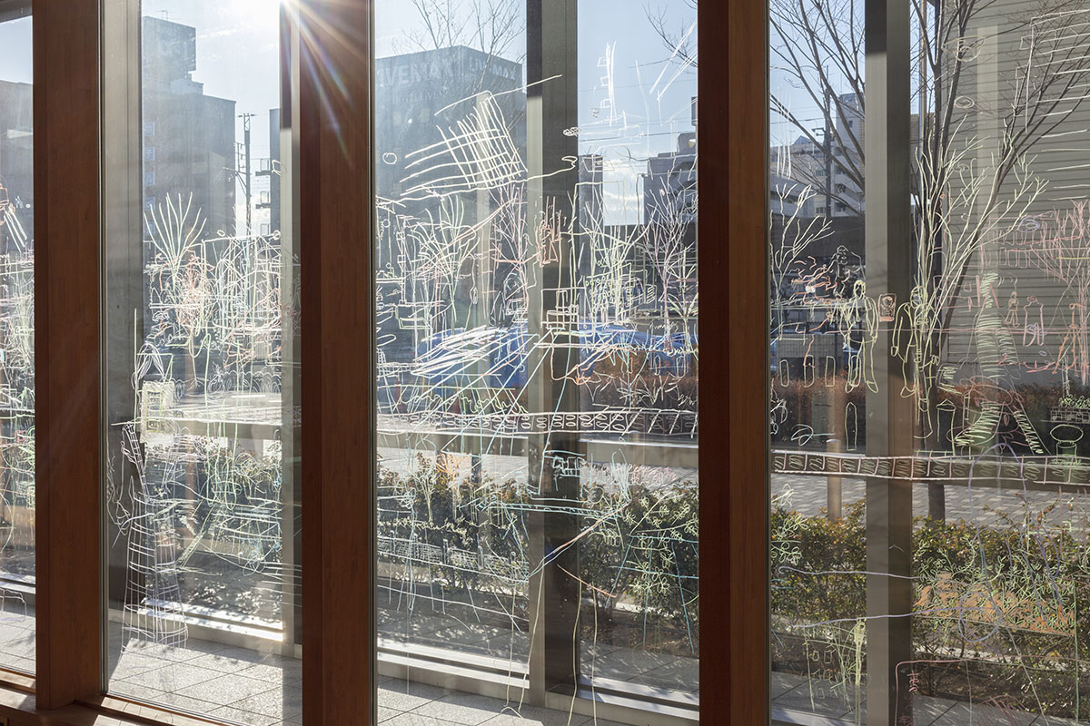 市役所の窓ガラスから見える景色をパステルで書き写しました。