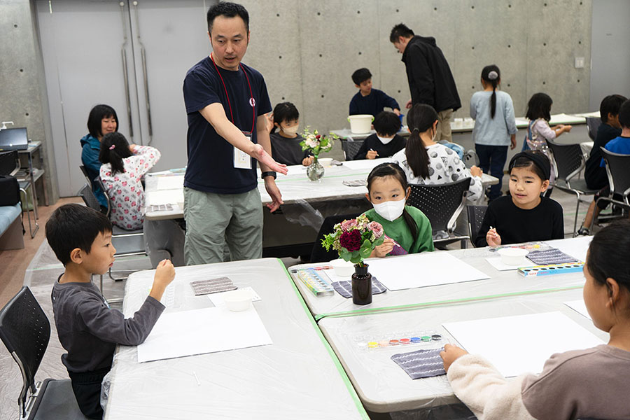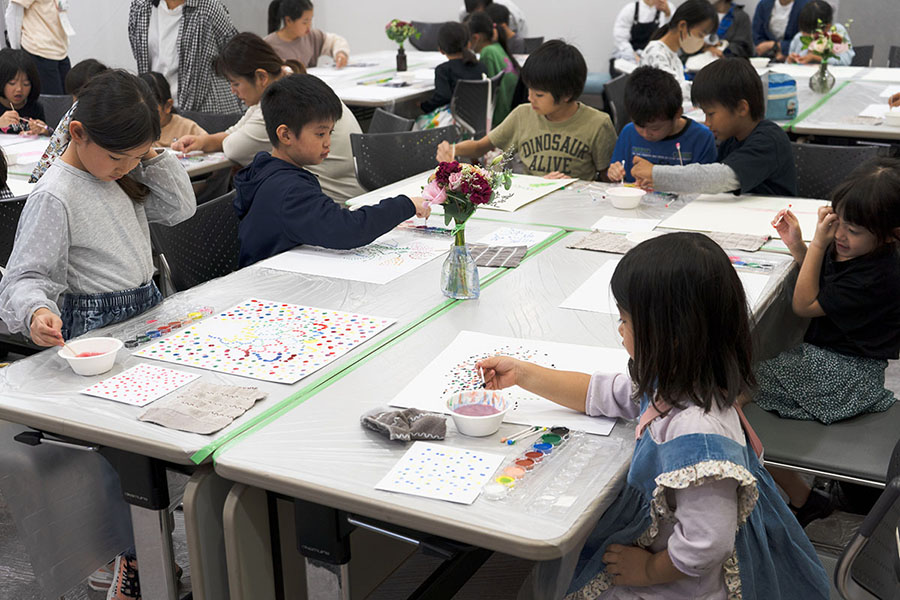 花束を見て、そこから表れる花束の周りの空気感を水彩のカラフルな色の点で描くワークショップを行いました。