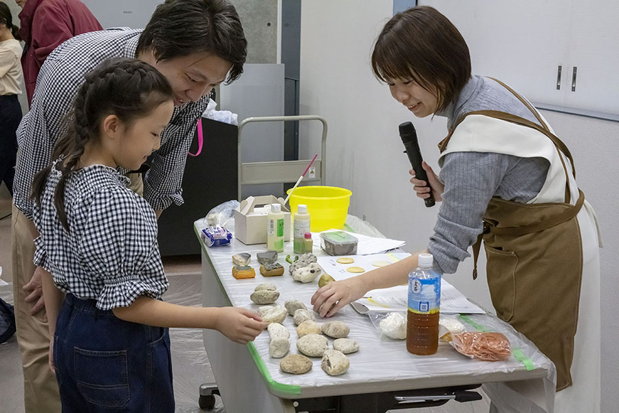 丸い石を見ながら樹脂粘土でじゃがいもを形態模写し、石が食べ物に見えてくる瞬間を体験するワークショップを行いました。