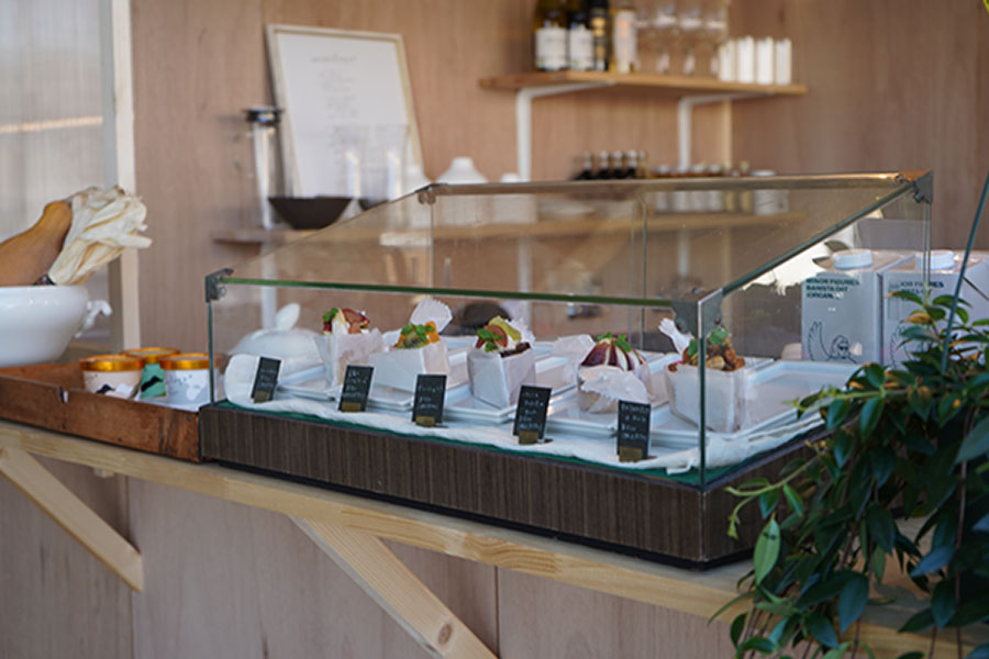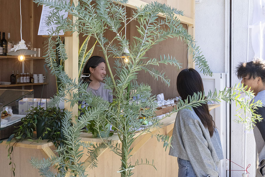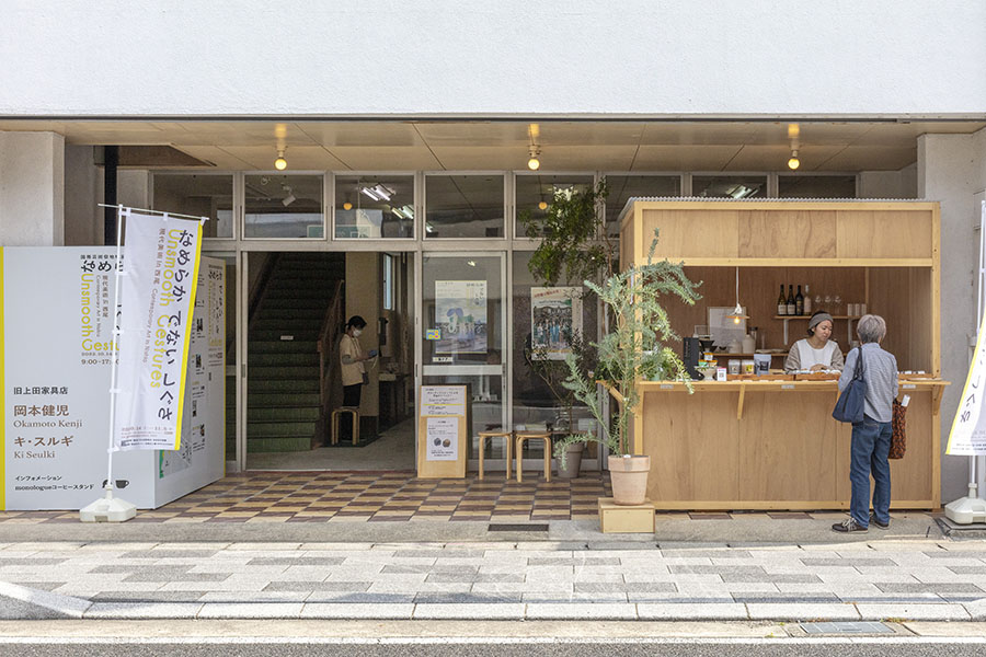 会期中、旧上田家具店に額田郡幸田町のヴィーガンレストラン「monologue」のコーヒースタンドが出店しました。旧上田家具店の岡本健児の展示空間内に、作品を鑑賞しながら購入したドリンクやスイーツを飲食できるカフェスペースを設けました。