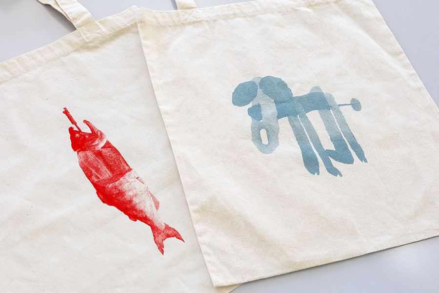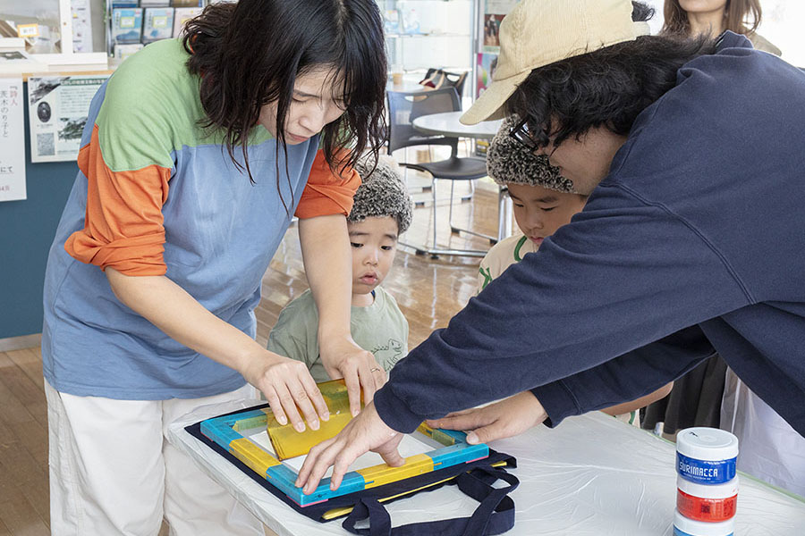 持参してもらったTシャツ等に、シルクスクリーンで好きな色を使って展覧会のロゴなどのモチーフを刷るワークショップを行いました。