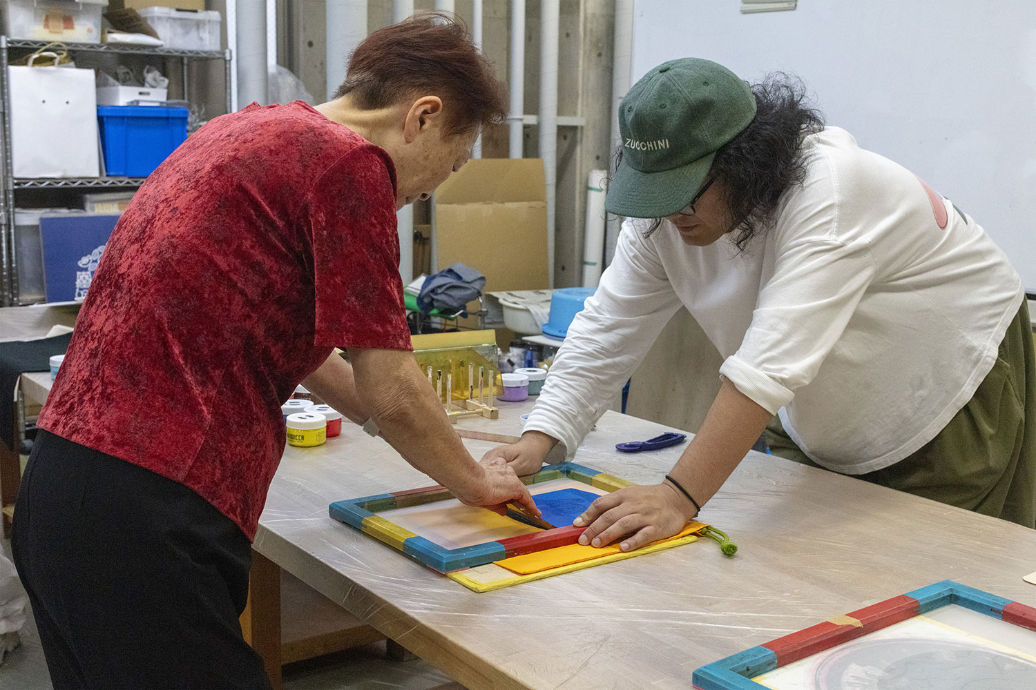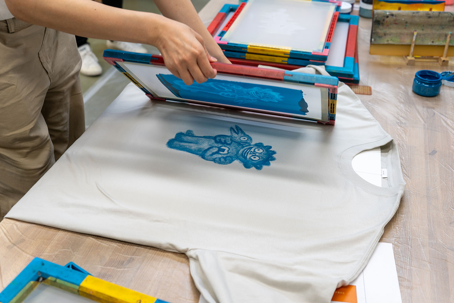 持参してもらったTシャツ等に、シルクスクリーンで展覧会のロゴや作品などのモチーフを刷るワークショップを行いました。