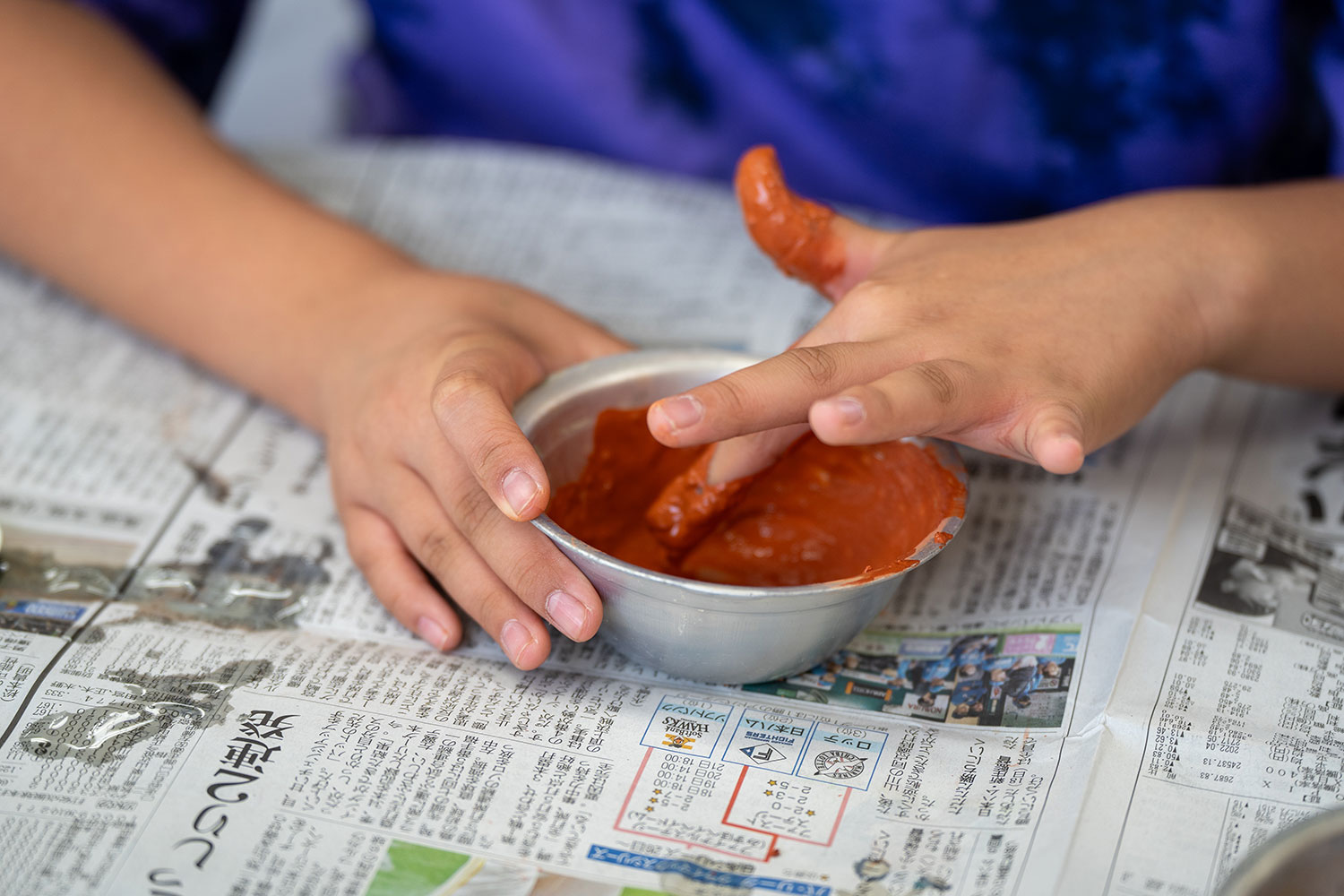 バレンを使わず、みんなで版を踏んで、身体全体で刷る体験をしました。- 日時: