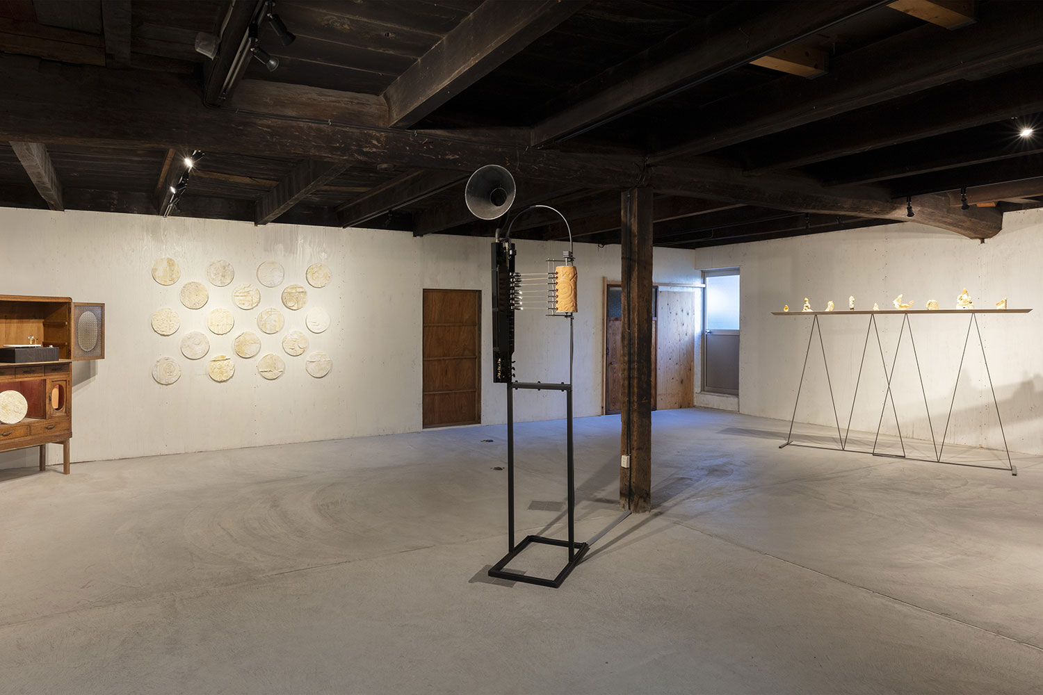 今回、藤田は瀬戸の街を散策し、マンホールや石垣、公園のタイルなど、街の至るところに見られる特徴的な模様を粘土を使って採集し、その凹凸を音に変換することで、瀬戸の街を聴覚的に再現しようと試みました。視覚的にも美しいこれらの模様は、藤田自らが設計したレコードプレーヤーやオルゴール機を通じて、音となって空間に響き渡ります。また、陶片に土が降り積もる作品では、焼かれることで陶片として固定された過去の時間と、その上に積もりゆく生の陶土がはらむ可変的な未来という、2つの異なる時間軸を融合させることを試みました。