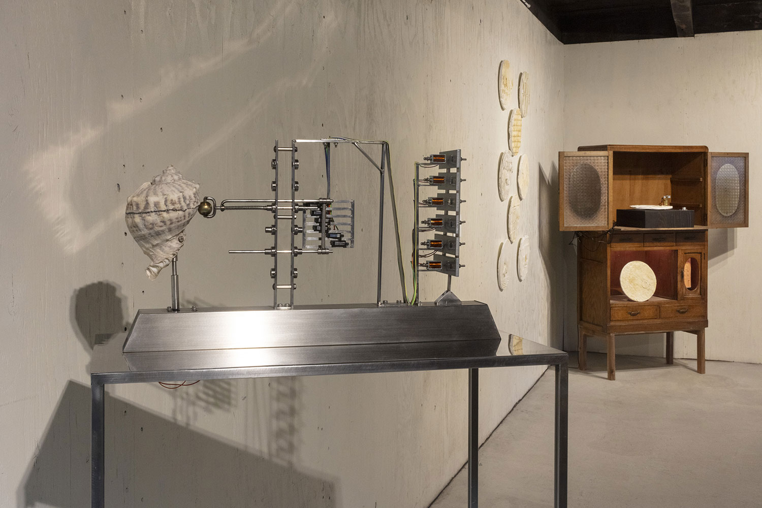 ゆるやかに回転し続ける貝や、模様が音に変換されていく様子、モコモコと降り積もった土を、わたしたちはついじっと見つめていたくなります。それは、有機的な形態や均質ではないリズム、ひいては偶然が導き出すいびつさが、鑑賞者の感覚に訴えかけているからかもしれません。