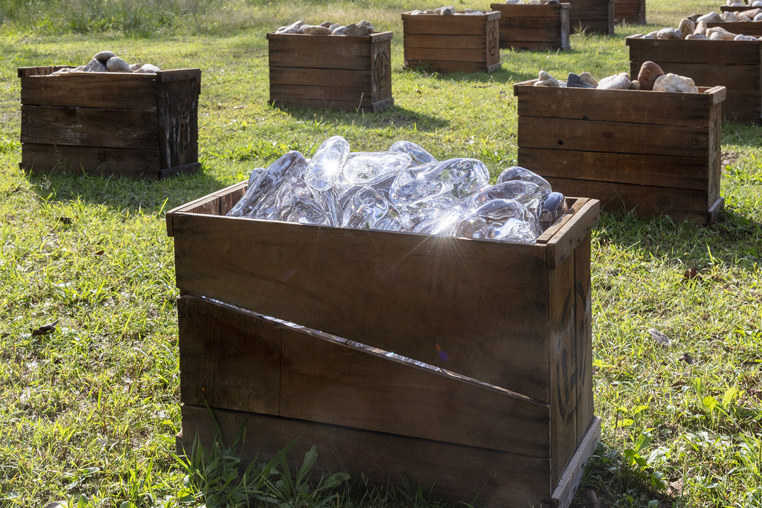 植村はこの場所の由来と昭和の時代感に焦点を当てました。広場には瀬戸の産業の基盤となってきた陶やガラスを塊として表現したものや、産業的な発展に伴い白濁していった瀬戸川の石など、往時の繁栄や人々の営み、あるいは時間経過を彷彿とさせる品々が、製品の輸送に使用されていたりんご箱に収められ、インスタレーションとして展開されました。