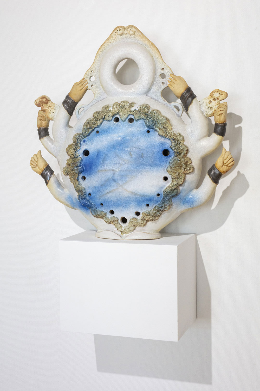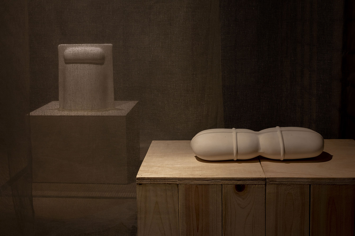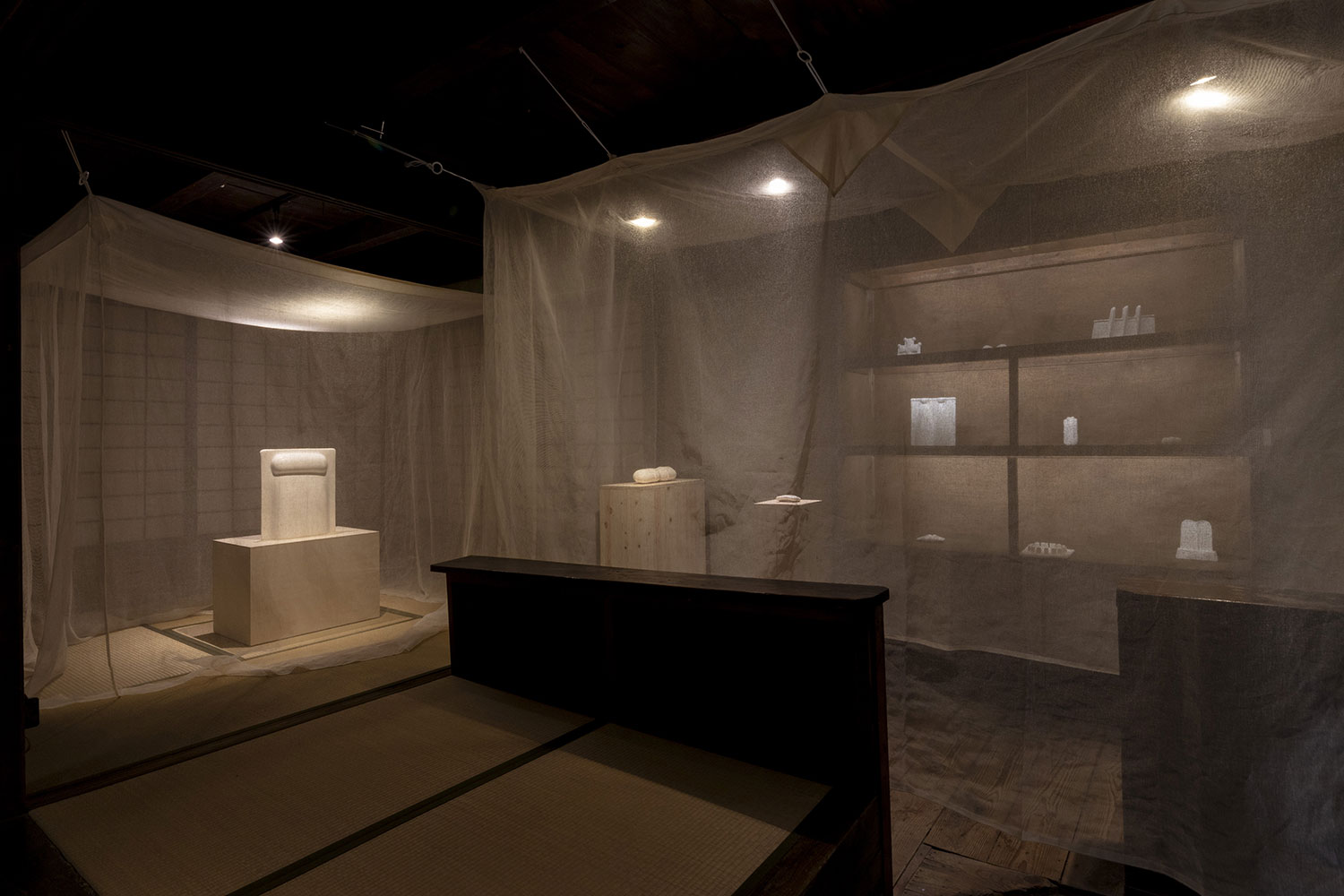 本展ではさらなる展開として、空間自体も取り込む在り方を模索しています。焼成というプロセスを経る陶の造形は、膜構造として空間を孕んで成立します。なぜなら、窯の中での水蒸気爆発による破損を避けるため、内部は空洞でなければならないからです。それゆえ塊のような形を作りたくても、通常は中身をくり抜くか、あるいは紐状の粘土を3Dプリンターのように輪積みすることで中空構造を作り出す必要があります。波多腰の作品は、自身の過去の記憶や情景などに、確かに存在した心地よい空気感や空間を捉えて内包するものとして、そのやきものならではの造形的特質と密接に関わりを結んだ表現となっています。そしてこれらをさらに薄布の空間内に置くことで、鑑賞者が内と外を行き来しつつ重層的な空間の存在を知覚する展示を成立させています。加えて波多腰の作品は、低火度で焼き上げることで柔らかな質感をともない、時に小さな穴が表面に穿たれています。それは空間を仕切りながらも閉ざしきらない薄布と呼応するかのように、私たちの意識を内と外との関係性へと誘っています。