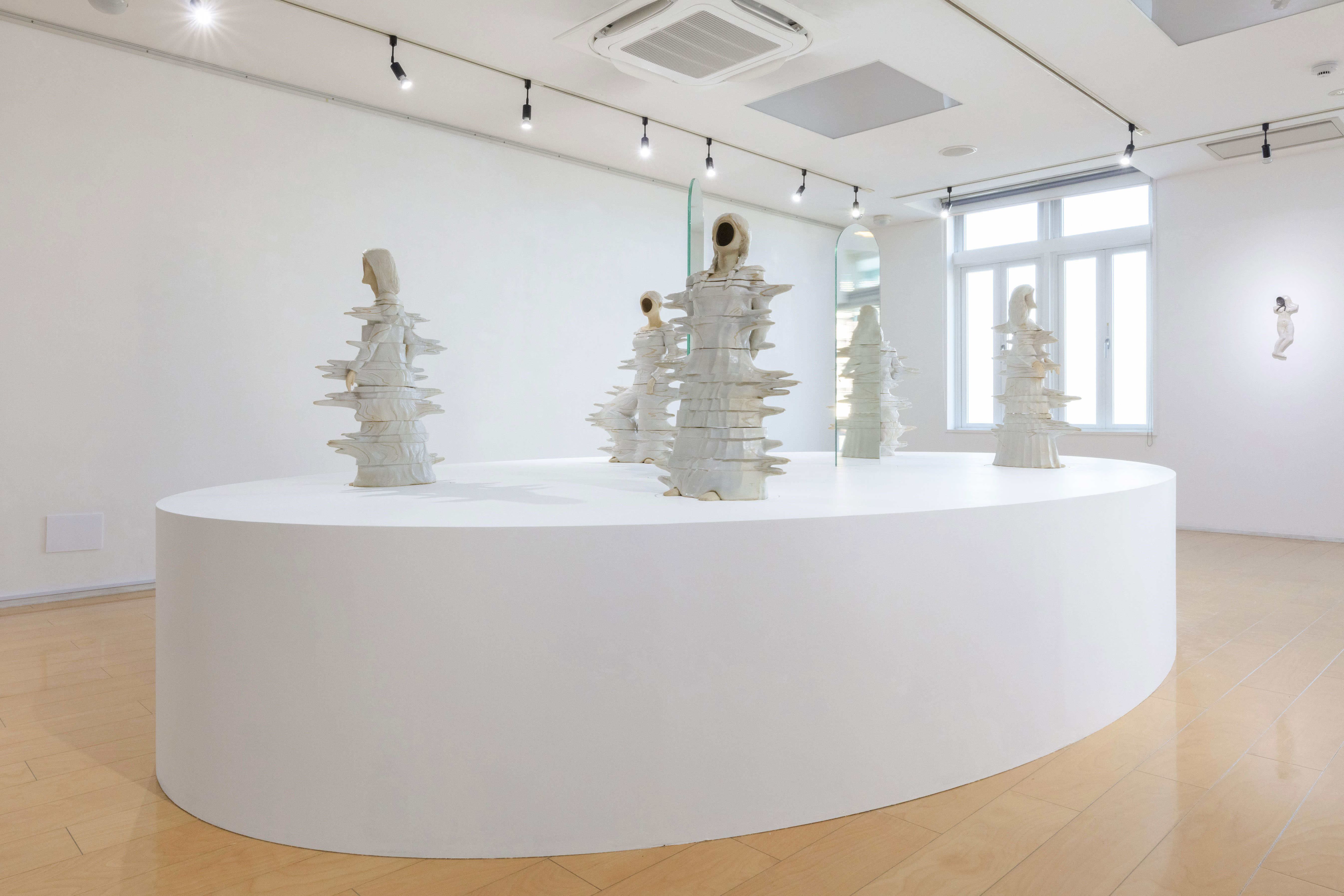 本展では、活動拠点を構える上海での生活のなかで、日本と同じ東アジア地域にカテゴライズされる国の人々との関わりから見えてくるものをテーマとしています。後藤によれば、東アジア地域に暮らす人々は外見上の特徴が近しいことも多く、見た目から出身国を類推できないことがしばしばあるといいます。しかし、現地での人との交流を通して見えてきたのは、陶の制作におけるロクロの回転方向が国や地域によって異なっていたり、中国語における「外巻」と「内巻」という言葉の意味がネガポジの関係性を持っていたり、あるいは「愛」という言葉の概念には国ごとに大きな相違があるなど、多様な差異が共存関係を保持していることでした。それらは国家や政治という大きな枠組みの相違では捉えきれず、目を凝らさないと見えてこないものです。本作において後藤はその現状を、上海で出会った東アジア地域の各地にルーツを持つ実在の友人をモチーフにした彫刻をつくり、それらが回転台の上でくるくると回る世界として表現しました。独自の解像度で描き出された、限りなく似通ったなかに存在するあちらとこちらは、虚構と現実という同時に存在する異なった世界をテーマとしてきた後藤ならではの視点がうかがえます。