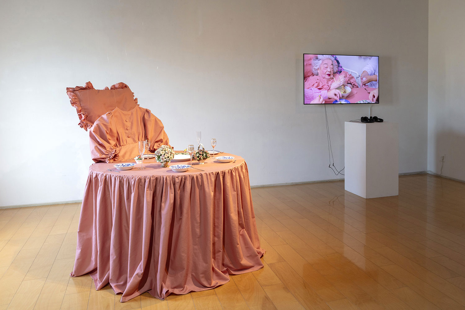 本展にあたって津野は、ベッドの上での臥床生活となって介護を要するため、共に食卓を囲むことが難しい最愛の祖母との日々の経験を元とした制作に取り組むことを決めました。介護を要するということは、これまでとは異なる日常を受け入れ、生活様式を変化させていくことが暗黙の前提となってしまいます。しかし、津野はその変化を受け入れつつも、介護ベッド上の祖母がテーブルクロスと一体となった衣服を着用し、他者を招き入れるという作品をつくることで、食卓を囲むというこれまでの日常を新たなかたちで実現しました。そこには家族や親族たちの温かで穏やかな関係性が可視化されています。さらに本作は、衣服が物理的に人々の間に介在することで、より密なコミュニティを構築し得る可能性も示唆しているのです。