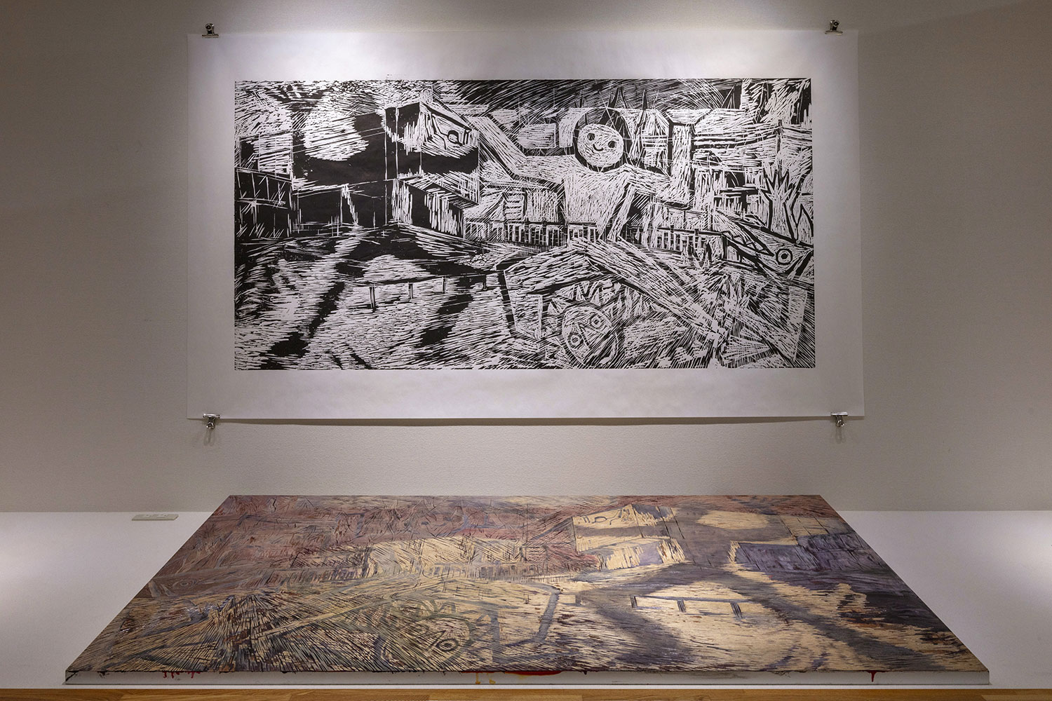 びっしりと画面を覆う無数の線が、画面の中にダイナミックな動きやうねりを生んでいます。よく見ると、それは描かれているのではなく、彫られていることがわかります。板を彫ってはそこに彩色を施すという作業を何度も繰り返すことで、表面には複雑な奥行きが生まれ、複数の視点や時間軸に基づくイメージが折り重なるように表されています。そのため、じっと画面を見つめていると次第に複数の図像の輪郭線が浮かび上がってきて、見る角度や距離によって図像や構図の見え方が異なるように感じられ、描き出されたもの同士の位置関係や空間に対する私たちの感覚をかき乱すかのように、観る人の視点を揺るがします。