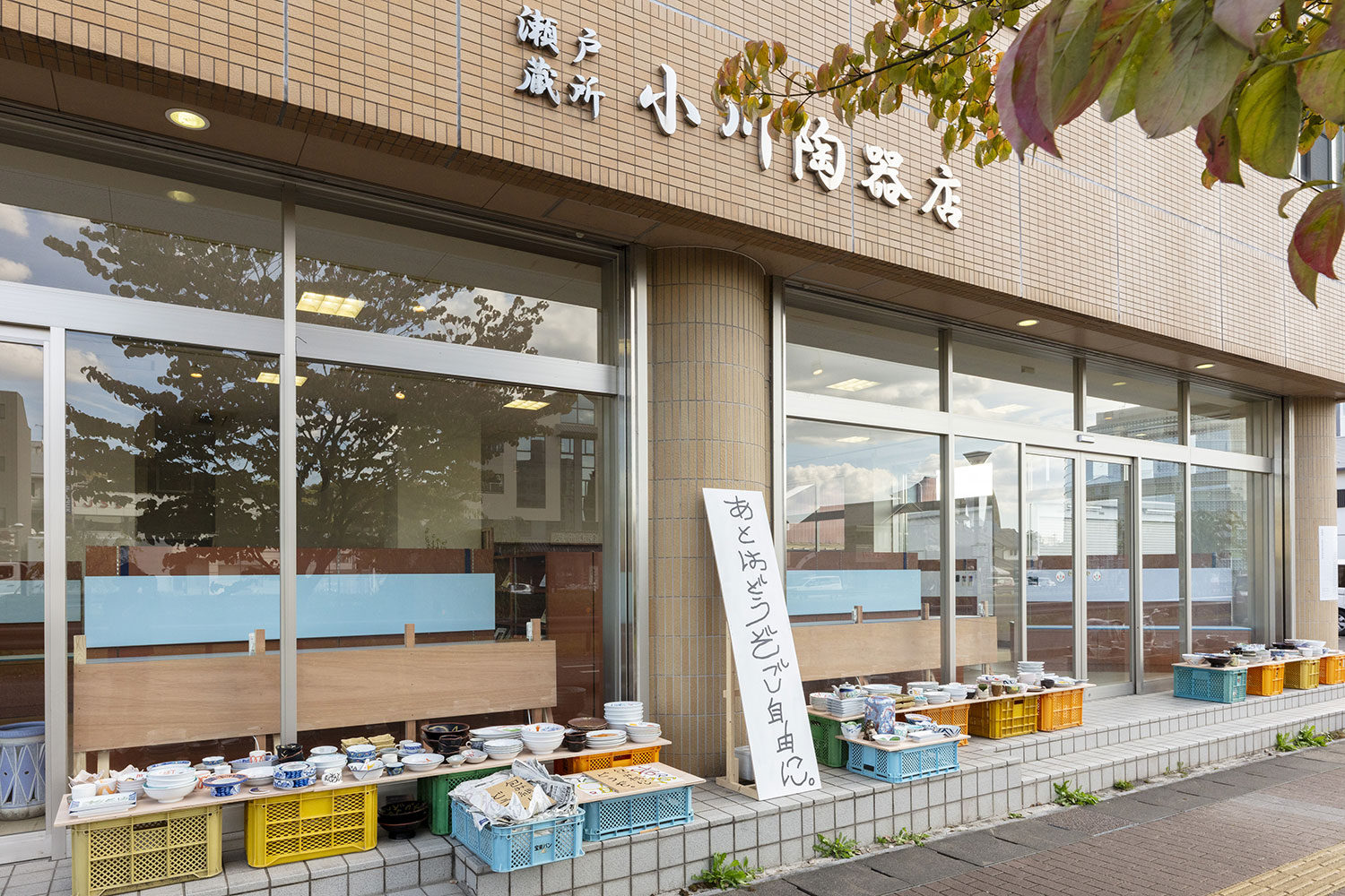 ずいぶん前に閉まったはずの老舗の陶器店に、「あとはどうぞご自由に。」の看板が見えます。店先に置かれたコンテナや簡易な棚にはところ狭しと食器が並んでいますが、瀬戸では見慣れた光景です。覗いてみれば、食器の一つ一つにも「ご自由に。」「ごかってに。」「かってにね。」といった、色とりどりの文字が踊っています。