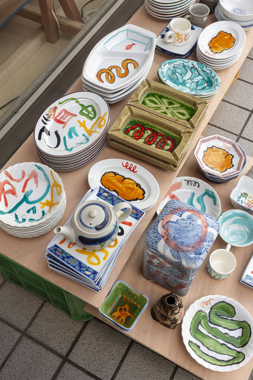 尾張瀬戸駅から瀬戸川を挟んだこのエリアには、江戸時代には陶磁器流通を管理した御蔵会所が置かれ、明治時代以降は陶磁器陳列館や役所などが並んでいました。今ではまちもずいぶん様変わりして、当時の名残は隣の瀬戸蔵に集約されています。2014年に閉業して以来店内で静かに埃をかぶっていた売れ残りの皿や丼、湯呑、鉢などの日用的な商品を譲り受けた光岡は、それらに上絵具で文字やイラストを描き足して窯入れし、新たに生命を吹き込みました。土という天然素材から生み出されるがゆえに、私たちはやきものに対してなんとなく環境に負荷をかけない「エコ」な印象を抱きがちですが、高温で焼かれ変質した陶土は放っておいても自然に還ることはありません。だから廃棄となれば、(リサイクル可能な一部のものを除いて)いずれ細かく砕かれ埋め立てられる運命にあります。