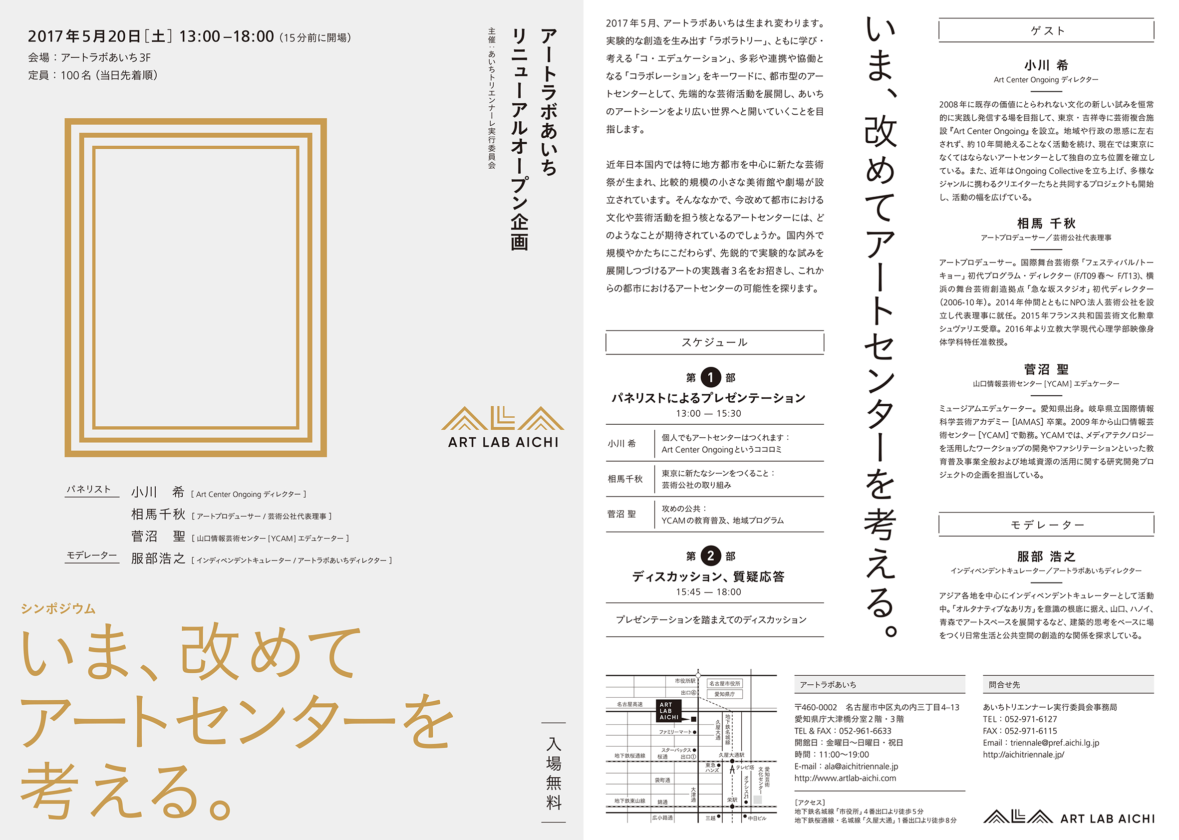あいちトリエンナーレを始めとする地域のアート情報発信拠点「アートラボあいち長者町」と「アートラボあいち大津橋」は愛知県庁大津橋分室内に集約し「アートラボあいち」として、平成29年5月20日(土)にリニューアルオープンします。