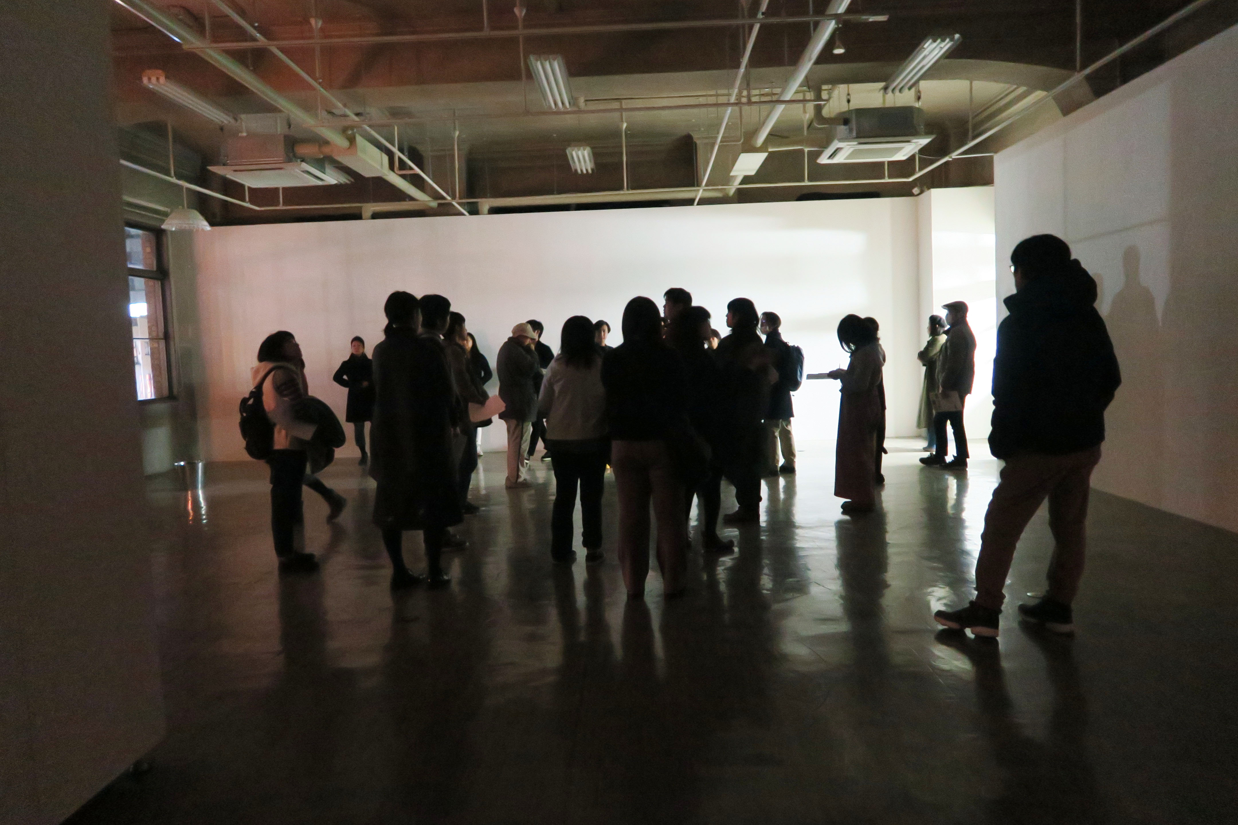 当館ディレクターの服部さんから、今村さんに展示を依頼することとなった背景が説明され、続いて今村さんからは過去の作品と今回の展示についてスライドを使って説明をしていただきました。最後には、全員で展示室に移動し、展示空間の中で、空間と時間についてお話しいただきました。