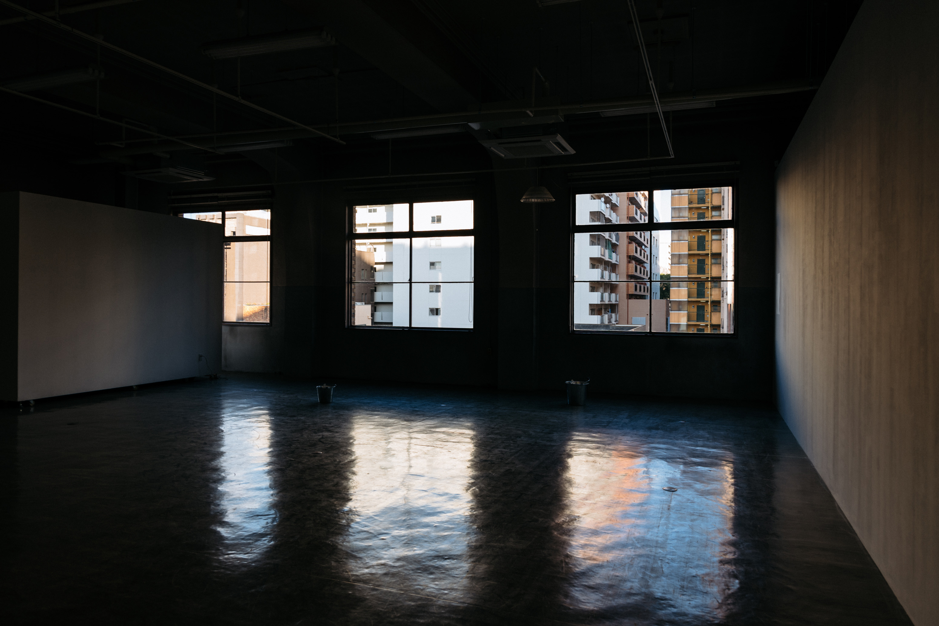 たとえば夜、iPad上の碧く光る海が闇に浮かんで見えたのも、明るいところでは白く輝き、そうでないところでは暗く沈みこむ二重性を持つブリキのバケツがその支持体に選ばれていたから、またそうした変化をわたしたちが検知するよう、頭上の照明が明滅していたからです。そこに置かれたものは、わたしたちとインタラクトしながら、部屋全体にも注意を向けさせます。閾値すれすれで鳴るコツンという音も、その源を求めるわたしたちをさらに彷徨わせるのです。そうして各部屋をめぐるうち、気がつけばこの建物が親密でかけがえのないものになっていました。あの夜、ストーブの灯りに導かれて目を向けた壁に、夜の光が昼間は見ることのない二つの窓枠の影をくっきりと映し出していたこと、また同じ壁の上で昼間はきらめいていたパステルが息を潜めていたことを、わたしはいつまでも忘れないでしょう。論理に基づくセンチメントが生み出す〈ない〉と〈ある〉の移行と重なり。雪は解けてもいたし、積もってもいたのです。