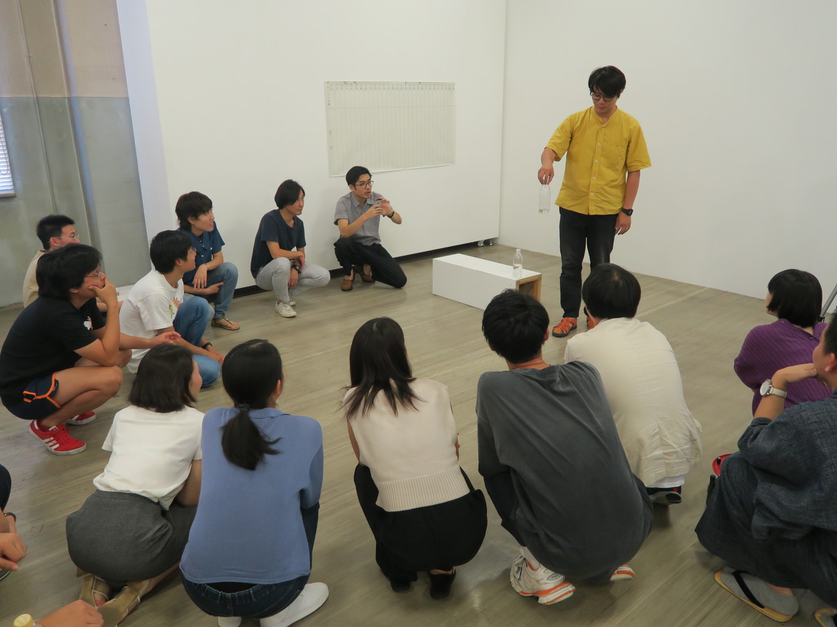 山城さんによる「感覚・経験・想像」にまつわるワークショップを1時間行いました。今現在もっとも興味があることとして「感覚」をとりあげた山城さん。感覚は、経験ともつながり、それは(直近の)未来を想像することにもつながるといいます。まずは小手調べとして「にぎってつぶつぶレインボーボール」を触ってみました。初めて触る人も多く「ひえ〜」という声が響きます。「これを触ったらどうなるか、想像できたでしょうか」と山城さん。全く同じ経験でなくても類似の何かを経験していることによって、この先どうなるか、という直近の未来の想像ができます。さらに、水が入ったペットボトルが2つ登場。水の量はそれぞれ違います。それらを台の端に置き、指で押したらどうなるか?をみんなで想像しました。1回転して口から落ちる、回転せずに落ちる、跳ねてとんでいく、などさまざまな予測が立てられます。実際にやってみると、空中で1回転したあと横向きに着地。「おおー!」と感嘆の声があがり、スマホのスローモーション機能で撮影するほどみんな予測の検証に熱中。では今度はもっと高いところから垂直に落下させたら?着地の後、回転する、跳ねる、などの予測が。実際は、ドスンと大きな音をたてて床で跳ねました。このときは、床の材質も事前にチェック。予測の材料にしました。